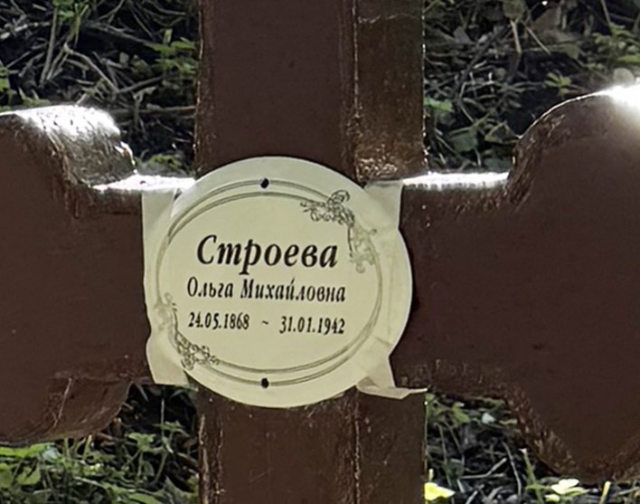Строева Ольга Михайловна (урожд. Соловьева), 1868 г. р. Место проживания: ул. Марата, д. 9. Дата смерти: январь 1942. Место захоронения: Смоленское кладб. (Остров Декабристов). (Блокада, т. 29)