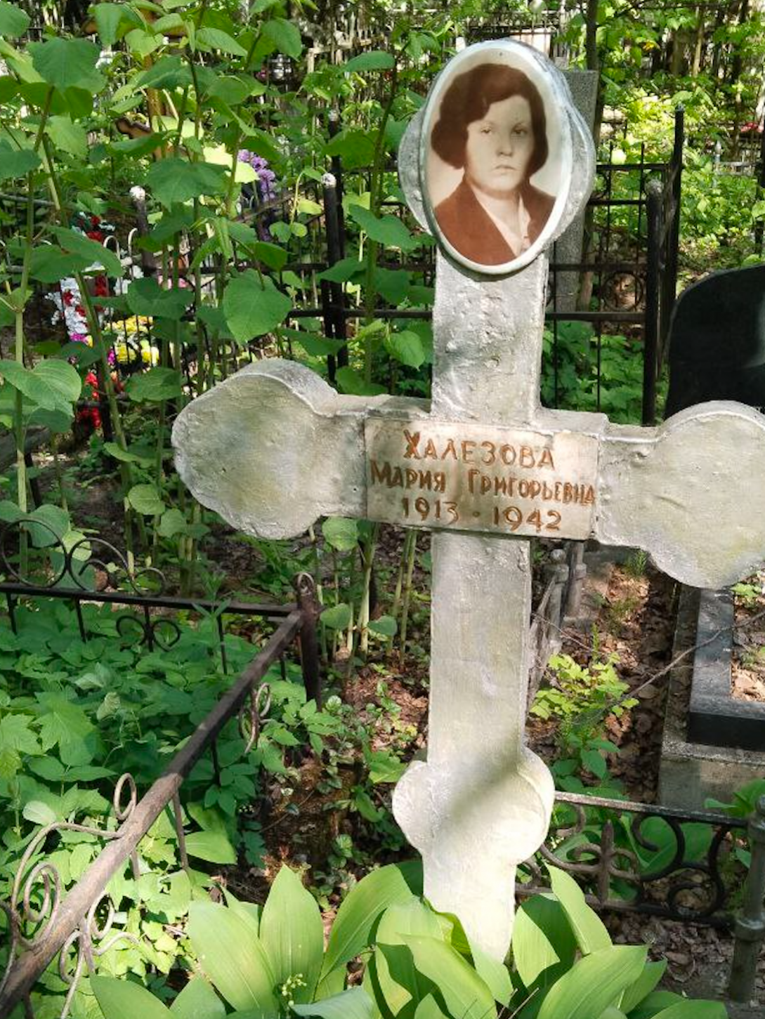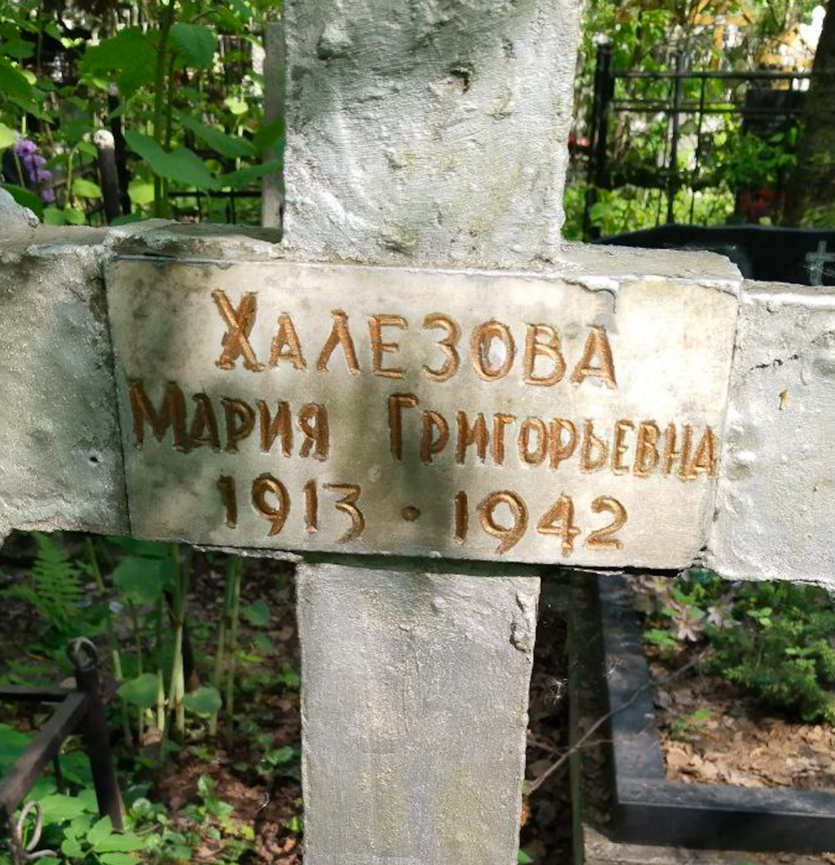 Халезова Мария Григорьевна, 1913 г. р. Место проживания: пр. Володарского, д. 40, кв. 10. Дата смерти: февраль 1942. Место захоронения: Большеохтинское кладб. (Блокада, т. 32: Хализова)