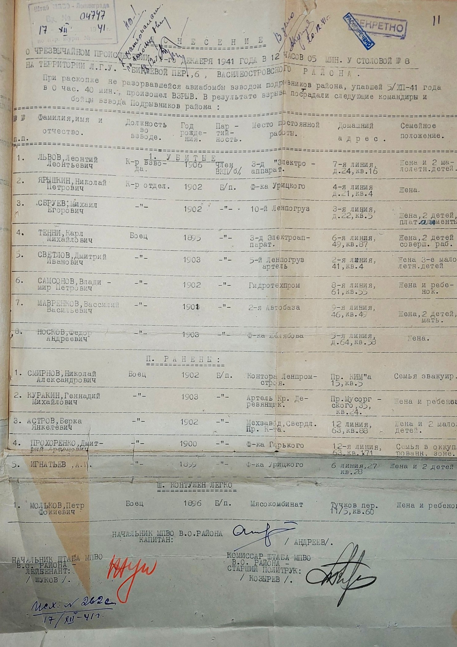 В 0 часов 40 минут 5 декабря 1941 года на площадь у столовой № 8 ЛГУ (ныне площадь Академика Сахарова) упала неразорвавшаяся авиабомба. При раскопках 11 декабря бомба взорвалась, погибли бойцы МПВО Василеостровского района: