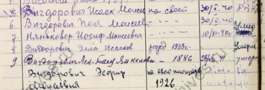 Сын – Вигдорович Исаак Моисеевич, 1915 г. р. Место проживания: ул. Чехова, д. 2/10, кв. 17. Призван в РККА.