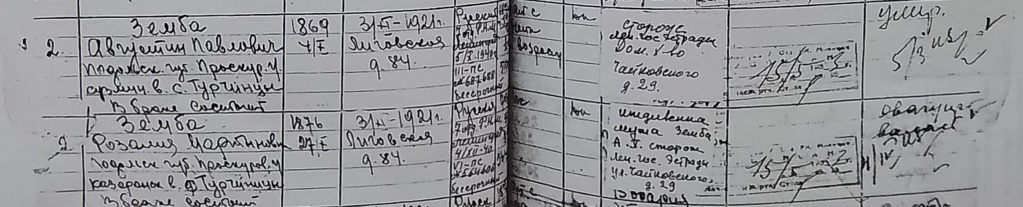 Земба Августин Павлович, 1869 г. р. Место проживания: ул. Чайковского, д. 24, кв. 2. Дата смерти: 5 марта 1942. Место захоронения: неизвестно. (Блокада, т. 10: Зембо Августина Павловна)