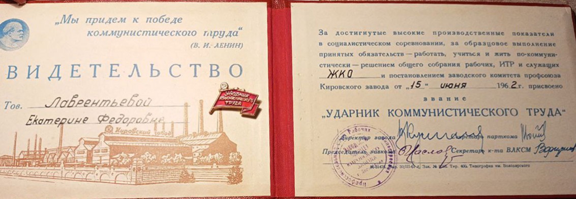 нагрудный значок «Ударник коммунистического труда» от 15 июня 1962 года.