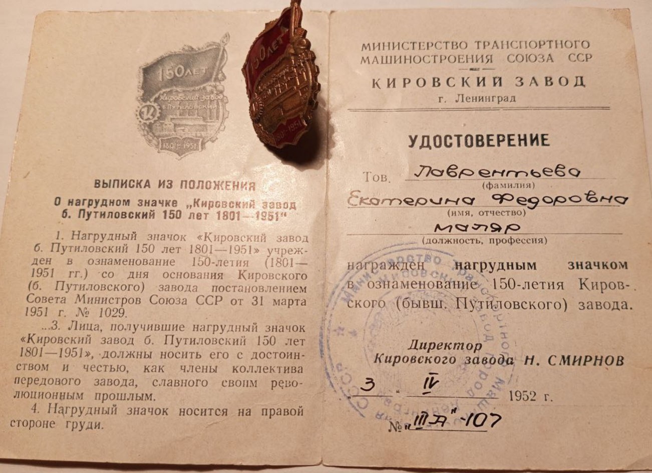 нагрудный значок «Кировский завод» от 3 апреля 1952 года;