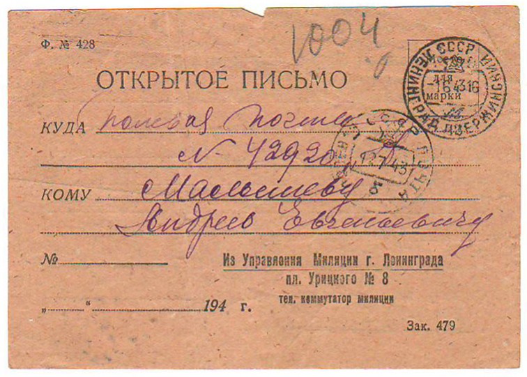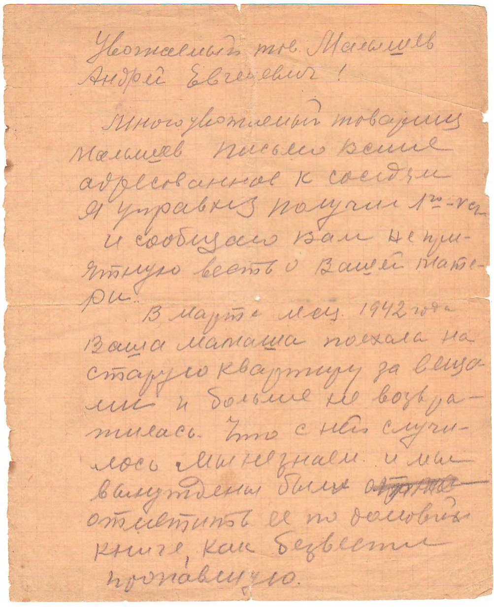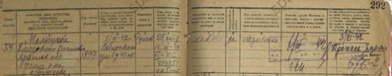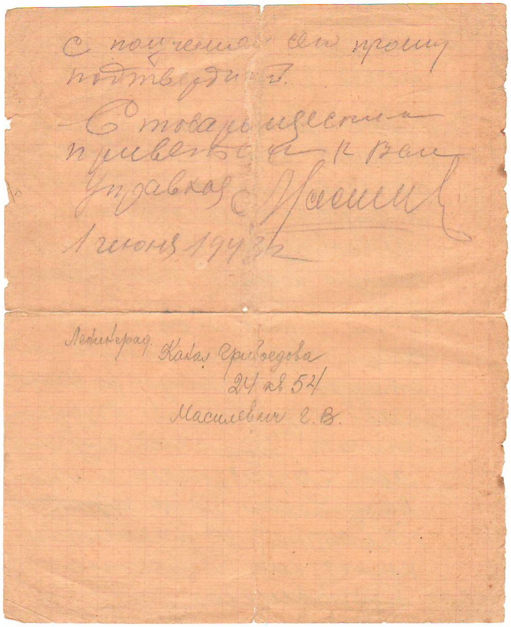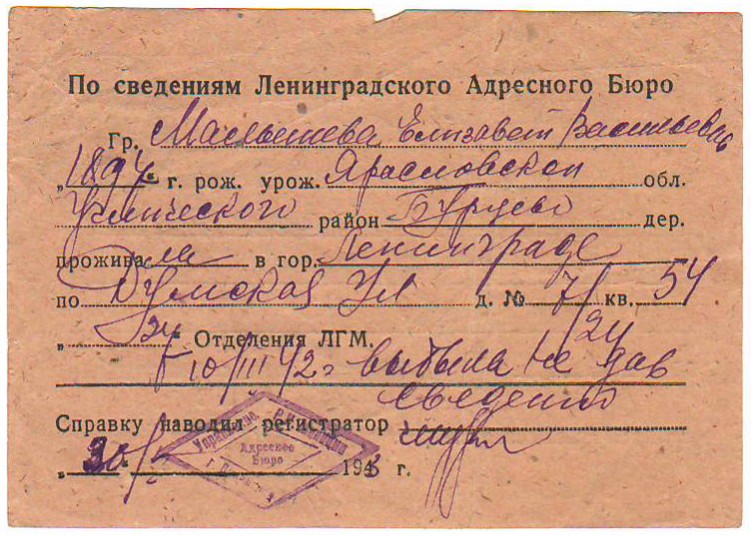О том, что она пропала без вести в Блокаду, свидетельствуют запись в домовой книге, а также письма её сыну, Андрею Евгеньевичу Малышеву, из милиции и от управдома в 1943 году.