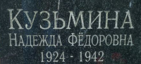 Кузьмина Надежда Федоровна, 1924 г. р. Место проживания: неизвестно. Дата смерти: 1942. Место захоронения: Пискаревское кладб., участок № 42 (индивидуальные гражданские захоронения). (В печатной Книге памяти «Блокада» отсутствует.)