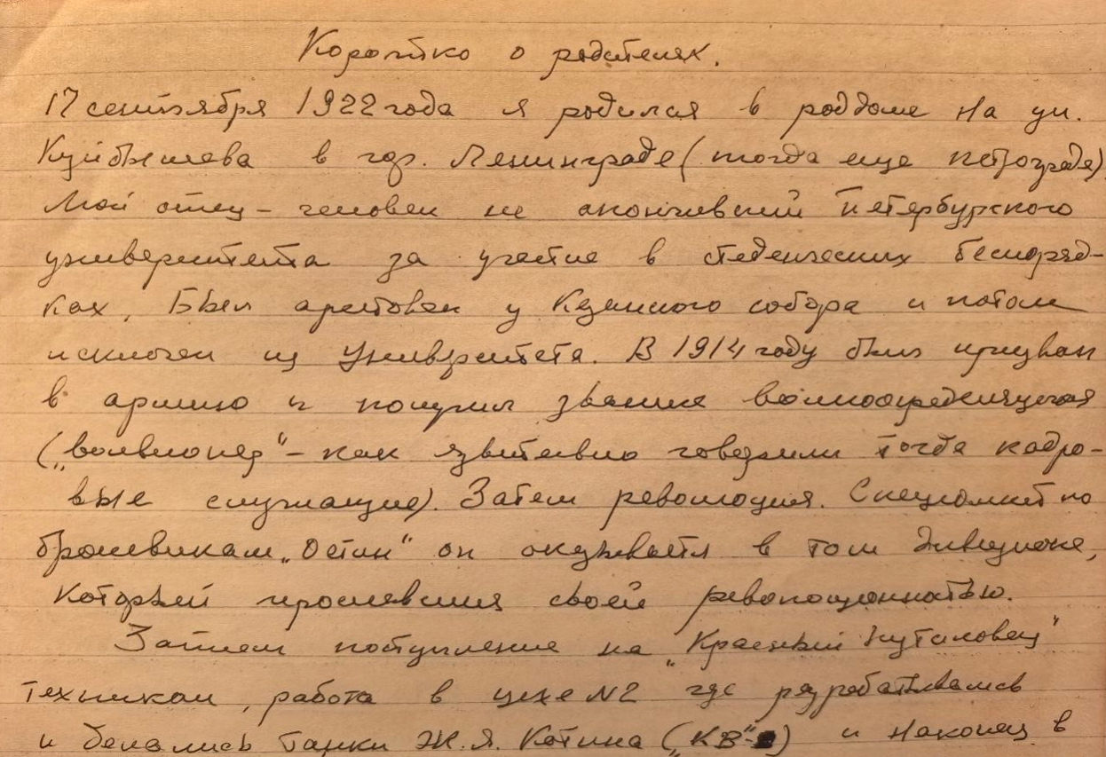 Дедушка, Юлиан Владимирович Себрант, брался писать свою биографию, но дальше записей о родителях не написал. Это более позднее свидетельство, когда он уже в солидном возрасте вспоминал детство (фото этой записи также прикладываю). Пишет, что его отец (Вольдемар) учился в Петербургском университете, но не окончил его из-за участия в студенческих беспорядках. Был арестован у Казанского собора и потом исключён из университета. В 1914 году был призван в армию и получил звание вольноопределяющегося («вольнопёр» – как язвительно говорили тогда кадровые служащие). После революции как специалист по броневикам «Остин» он оказывается в том дивизионе, который прославился своей революционностью. Затем поступление на «Красный Путиловец», техникум, работа в цехе № 2, где разрабатывались и делались танки Ж. Я. Котина (КВ-2).