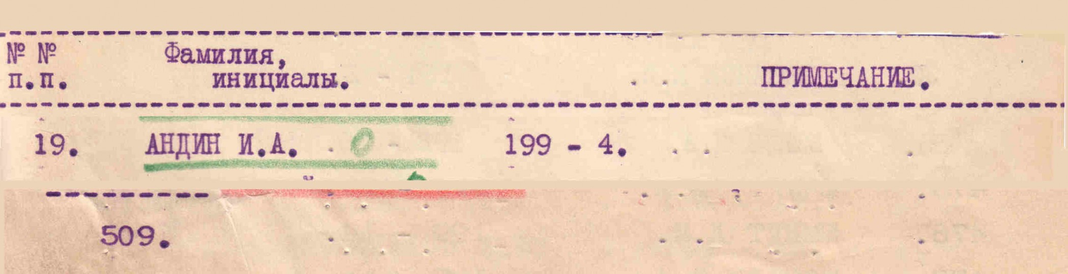 Андин Игнатий Антонович, 1899 г. р., уроженец Латвии, латыш, б. член ВКП(б), экономист-финансист. Особым совещанием при НКВД СССР 19 января 1936 г. осужден "по подозрению в шпионской деятельности" на 5 лет ИТЛ. Отбывал наказание в Соловецкой тюрьме. Особой тройкой УНКВД ЛО 25 ноября 1937 г. приговорен по ст. ст. 58-6-11 к высшей мере наказания. Расстрелян 8 декабря 1937 г. Вероятное место расстрела и погребения: район Лодейнопольского лагпункта.