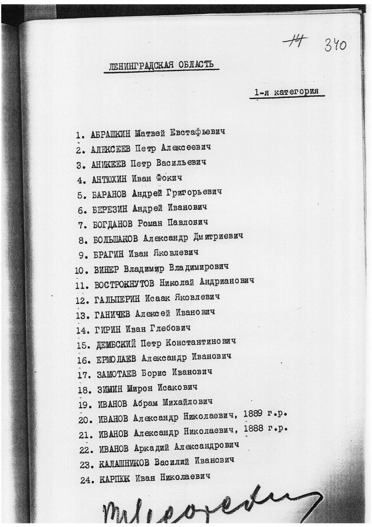 Антюхин Иван Фокич, 1894 г. р., уроженец д. Казанское Бологовского р-на Калининской обл., русский, член ВКП(б) в 1912–1937 гг., делегат XVII съезда ВКП(б), управляющий Ленэнерго, проживал: г. Ленинград, Кировский пр., д. 26/28, кв. 15. Арестован 5 июля 1937 г. Выездной сессией Военной коллегии Верховного суда СССР в г. Ленинград 9 сентября 1937 г. приговорен по ст. ст. 58-7-8-11 УК РСФСР к высшей мере наказания. Расстрелян в г. Ленинград 9 сентября 1937 г.
