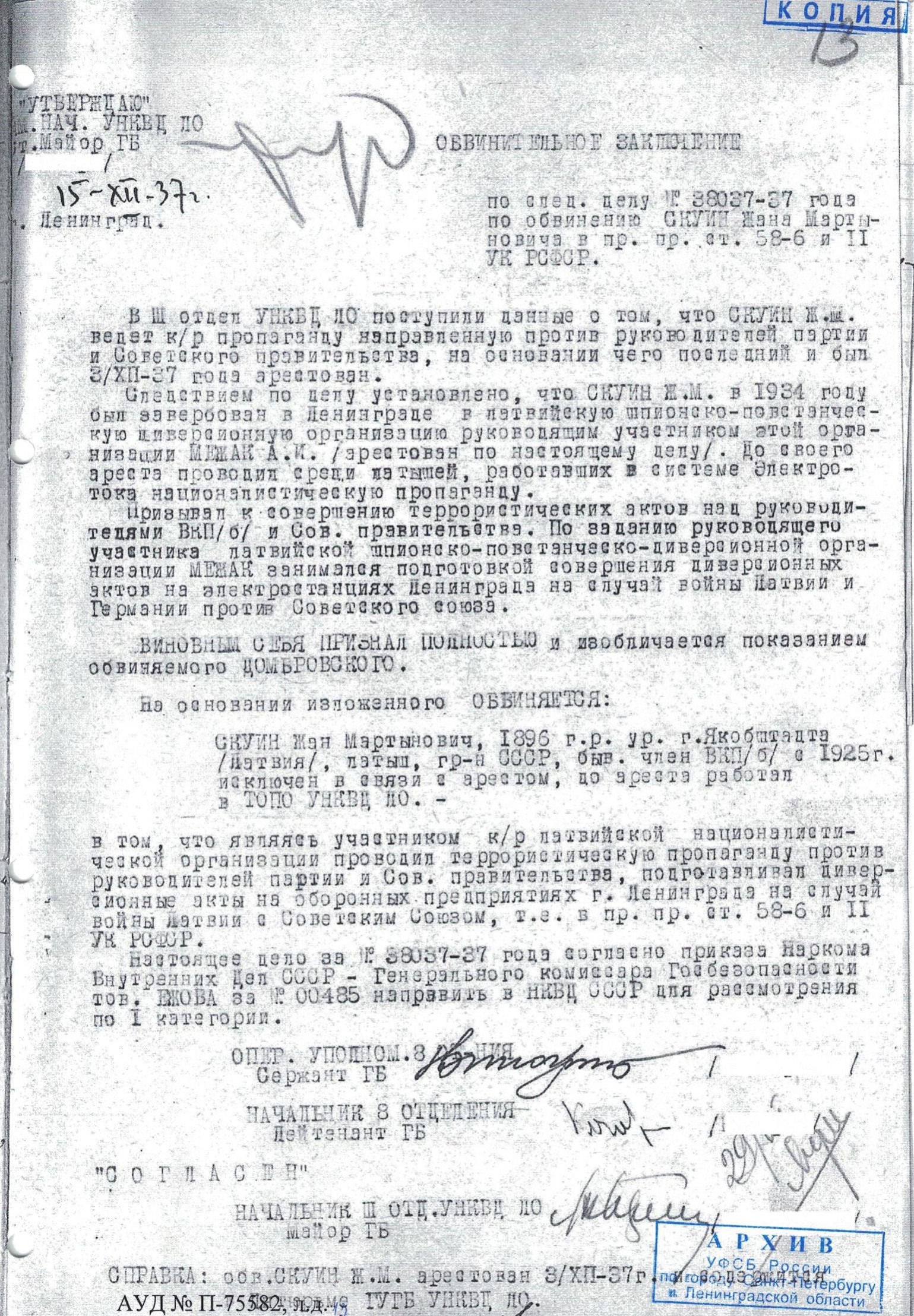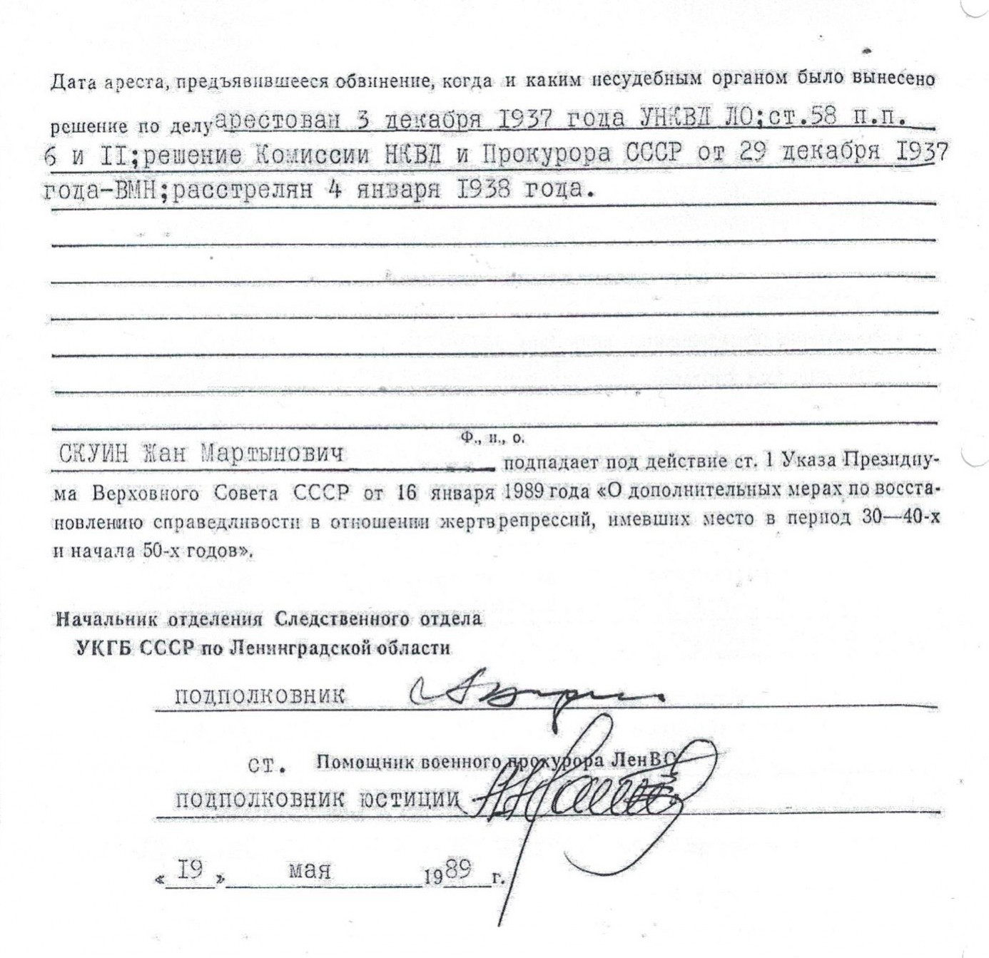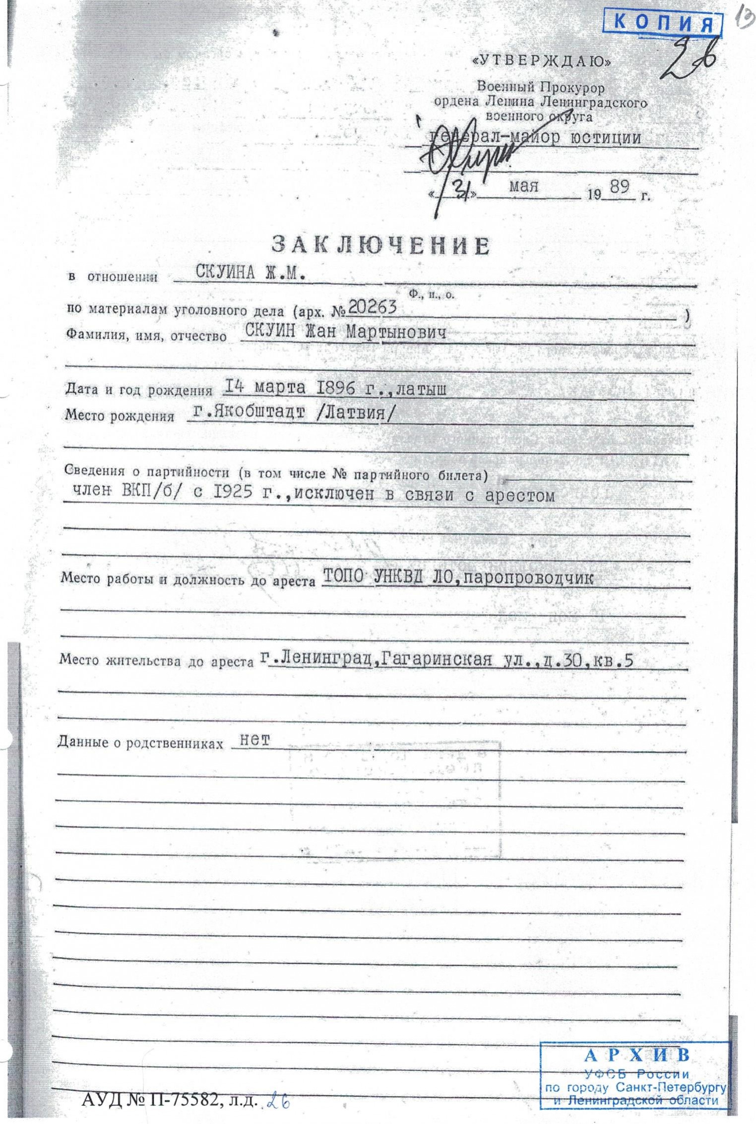 Скуин Жан Мартынович, 1896 г. р., уроженец г. Якобштадт Курляндской губ., латыш, член ВКП(б) в 1925–1937 гг., паропроводчик Торгово-производственного отдела УНКВД ЛО, проживал: г. Ленинград, Гагаринская ул., д. 30, кв. 5. Арестован 3 декабря 1937 г. Комиссией НКВД и Прокуратуры СССР 29 декабря 1937 г. приговорен по ст. ст. 58-6-11 УК РСФСР к высшей мере наказания. Расстрелян в г. Ленинград 4 января 1938 г.