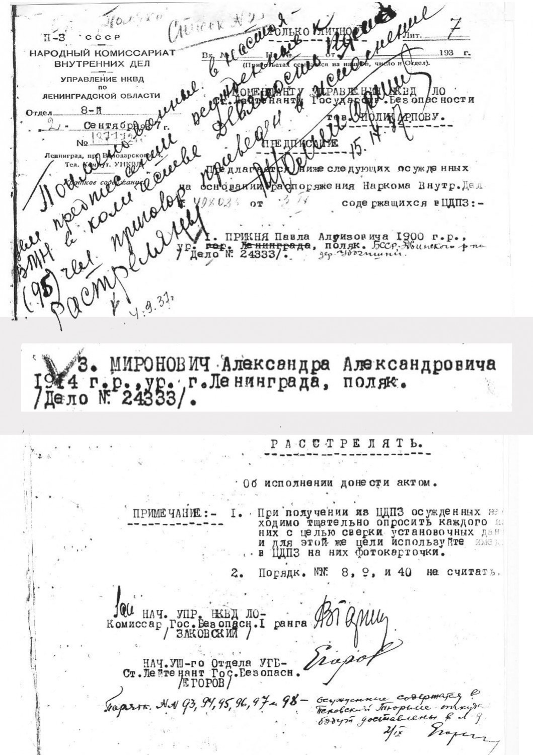 Миронович Александр Александрович, 1914 г. р., уроженец и житель г. Ленинград, поляк, беспартийный, токарь военного завода им. Жданова. Арестован 2 августа 1937 г. Комиссией НКВД и Прокуратуры СССР 31 августа 1937 г. приговорен по ст. ст. 58-6-11 УК РСФСР к высшей мере наказания. Расстрелян в г. Ленинград 4 сентября (15 сентября) 1937 г.