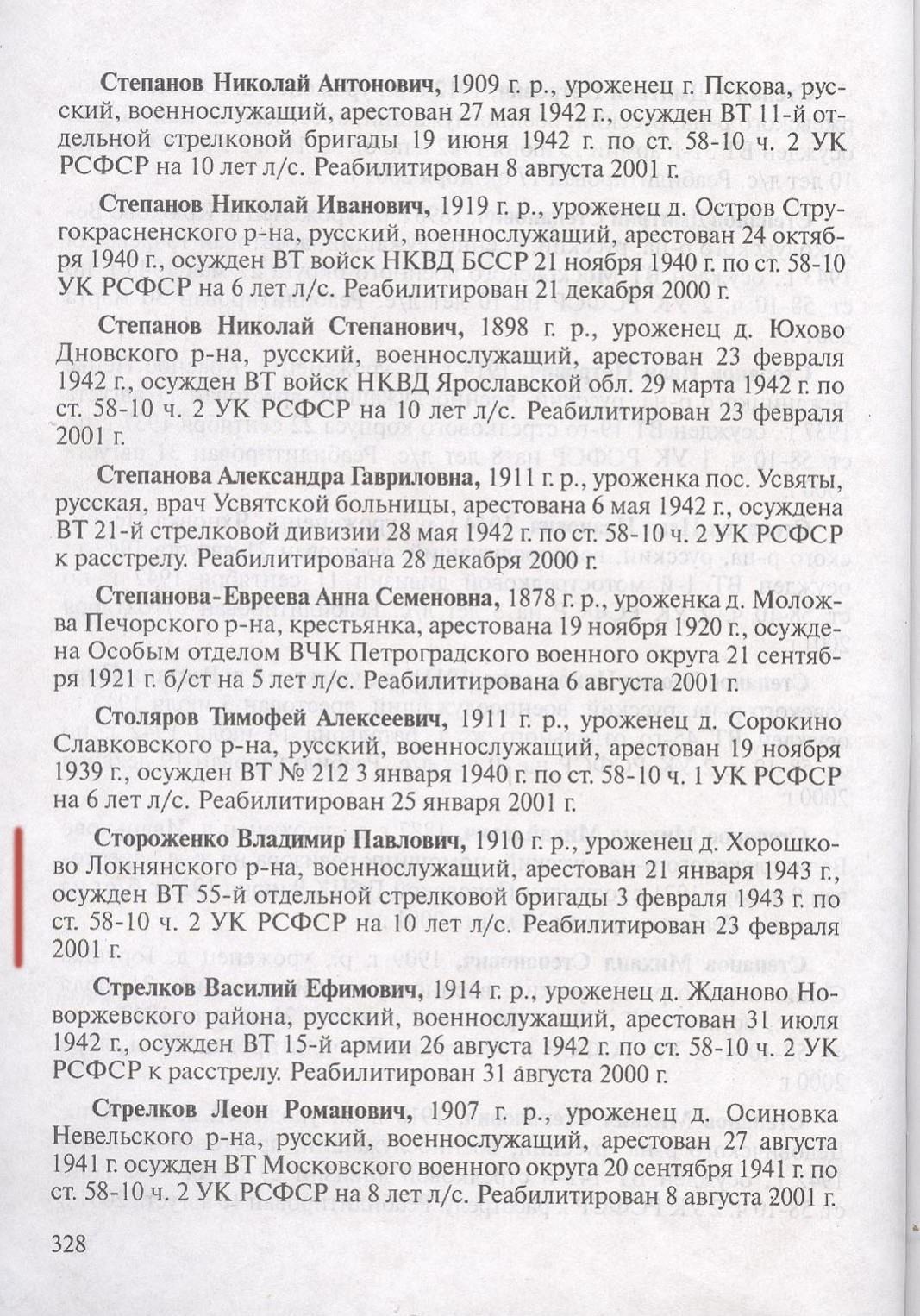 Стороженко Владимир Павлович, 1910 г. р., уроженец д. Хорошково Локнянского р-на, военнослужащий, арестован 21 января 1943 г., осужден ВТ 55-й отдельной стрелковой бригады 3 февраля 1943 г. по ст. 58-10 ч. 2 УК РСФСР на 10 лет л/с. Реабилитирован 23 февраля 2001 г. (ПсковКП-12)