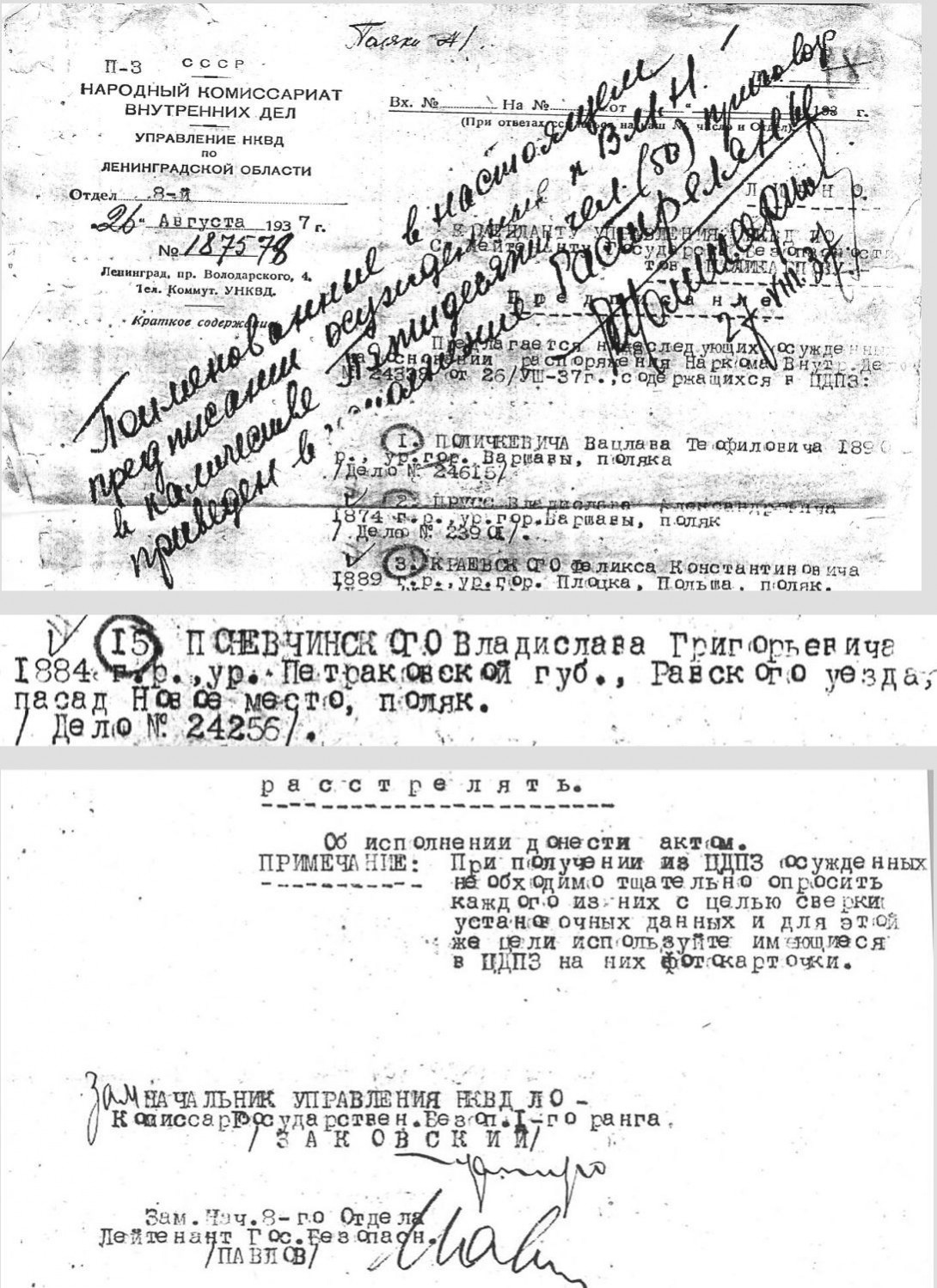 Поневчинский Владислав Григорьевич, 1884 г. р., уроженец посада Нове Място Равского у. Петроковской губ., поляк, член ВКП(б) в 1924-1937 гг., мастер цеха № 35 военного завода "Большевик", проживал: г. Ленинград. Арестован 16 июля 1937 г. Комиссией НКВД и Прокуратуры СССР 25 августа 1937 г. приговорен по ст. ст. 58-6-8-11 УК РСФСР к высшей мере наказания. Расстрелян в г. Ленинград 27 августа 1937 г.