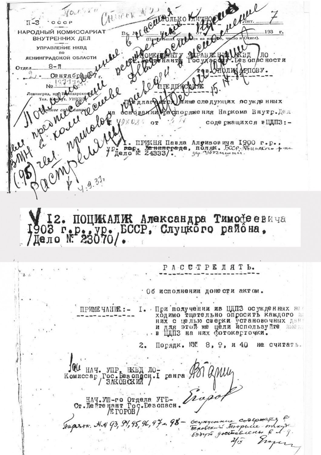 Поцикалик Александр Тимофеевич, 1903 г. р., уроженец Слуцкого р-на БССР, белорус, беспартийный, ветеринарный врач Ветеринарной бактериологической лаборатории, проживал: г. Ленинград. Арестован 13 февраля 1937 г. Комиссией НКВД и Прокуратуры СССР 31 августа 1937 г. приговорен по ст. ст. 58-9-11 УК РСФСР к высшей мере наказания. Расстрелян в г. Ленинград 4 сентября (15 сентября) 1937 г.