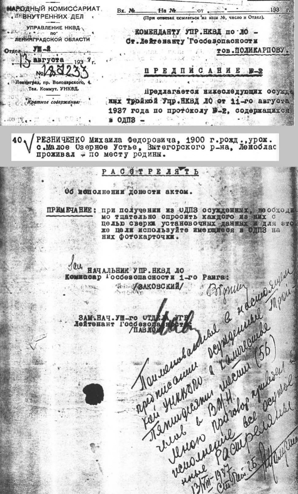 Резниченко Михаил Федорович, 1900 г. р., уроженец и житель д. Малое Озерное Устье Вытегорского р-на Лен. обл., русский, беспартийный, рабочий аварийной конторы Свирьлес. Арестован 1 марта 1937 г. Особой тройкой УНКВД ЛО 11 августа 1937 г. приговорен по ст. ст. 58-10-11 УК РСФСР к высшей мере наказания. Расстрелян в г. Ленинград 13 августа 1937 г.