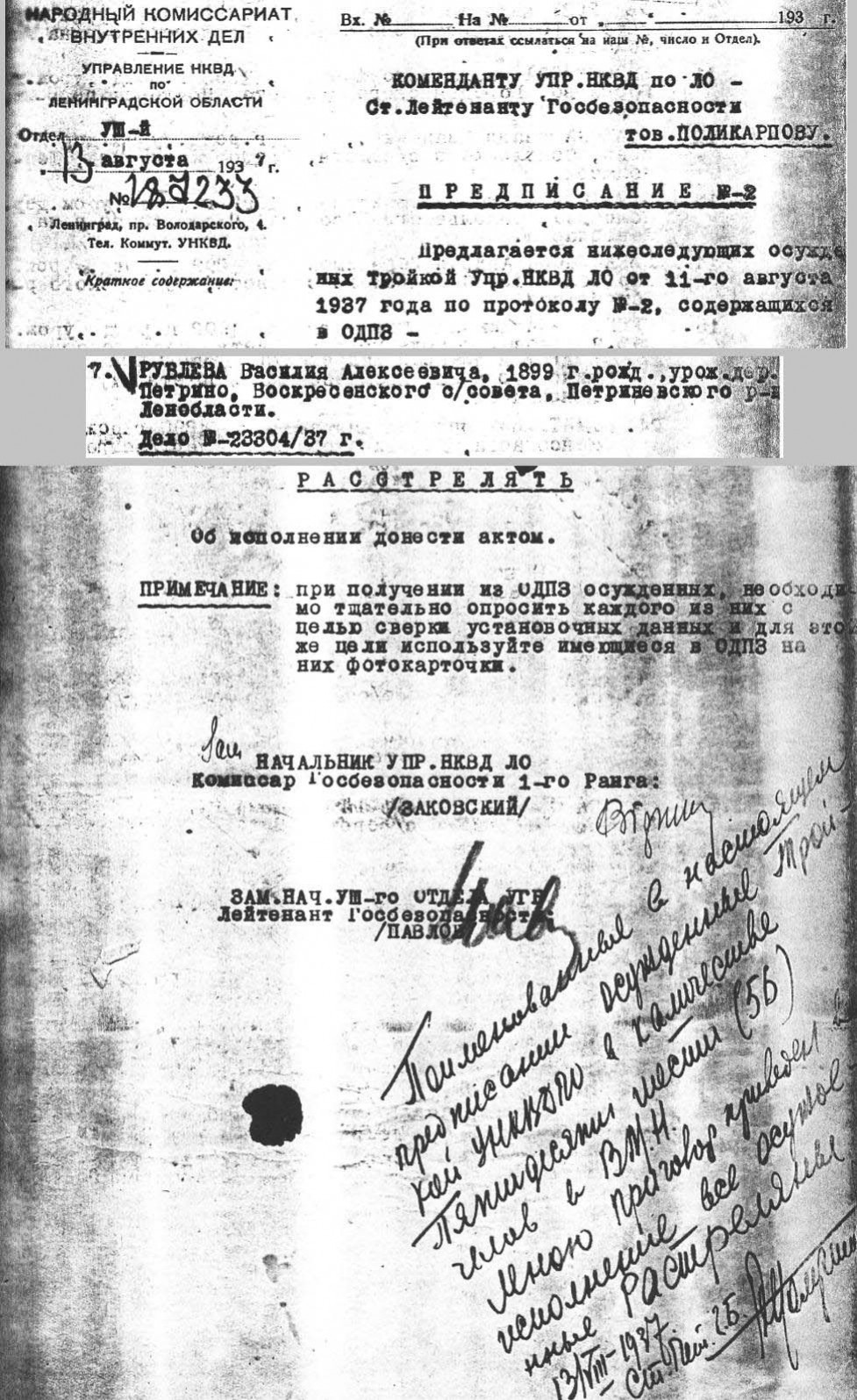 Рублев Василий Алексеевич, 1899 г. р., уроженец и житель д. Петрино Петриневского р-на Лен. обл., русский, беспартийный, член колхоза "Ермоловское". Арестован 23 апреля 1937 г. Особой тройкой УНКВД ЛО 11 августа 1937 г. приговорен по ст. ст. 19-58-8; 58-10-11 УК РСФСР к высшей мере наказания. Расстрелян в г. Ленинград 13 августа 1937 г.