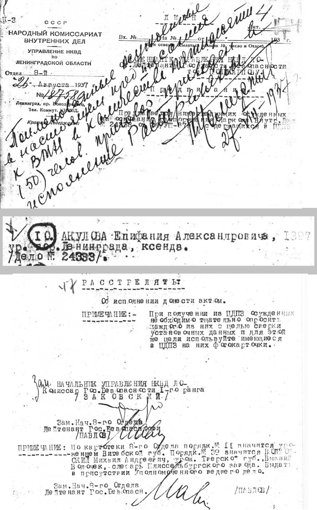 Акулов Игорь Александрович (монах Епифаний), 1897 г. р., уроженец с. Ново-Никитское Корчевского у. Тверской губ., русский, беспартийный, ксендз, служил в костелах св. Алексея и св. Франциска в Ленинграде. Неоднократно арестовывался. Вновь арестован 26 июля 1937 г. Комиссией НКВД и Прокуратуры СССР 25 августа 1937 г. приговорен по ст. ст. 58-6-11 УК РСФСР к высшей мере наказания. Расстрелян в г. Ленинград 27 августа 1937 г.
