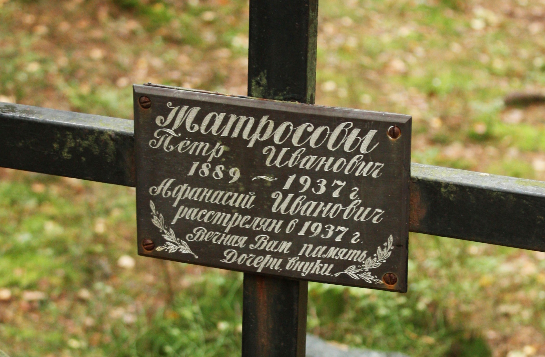 Матросов Афанасий Иванович, 1883 г. р., уроженец д. Новоселок Оятского р-на Лен. обл., русский, беспартийный, директор универмага, проживал: г. Лодейное Поле, ул. Коммунаров, д. 14. Арестован 23 сентября 1937 г. Особой тройкой УНКВД ЛО 9 октября 1937 г. приговорен по ст. 58-10 УК РСФСР к высшей мере наказания. Расстрелян в г. Ленинград 11 октября 1937 г.